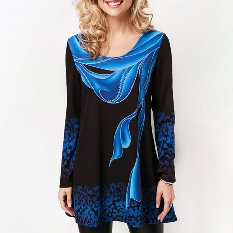 Blouse femme avec décolleté rond et manches longues. Coupe plus longue et ample. Imprimé avec un motif coloré intéressant.