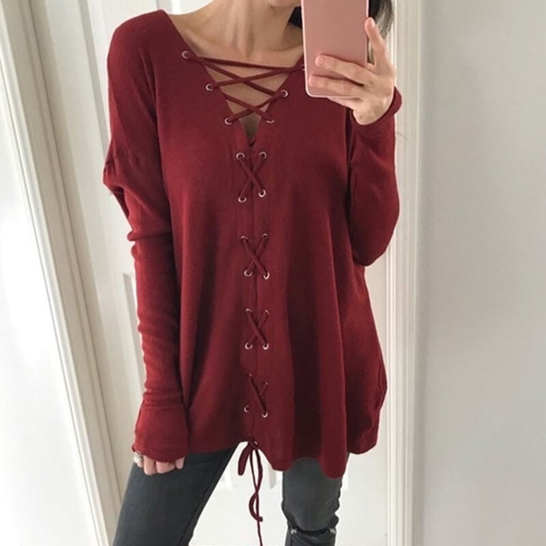 Blouse pour femme à manches longues. La blouse a un décolleté en V avec un lacet. Coupe longue et ample. Disponible en plusieurs coloris.