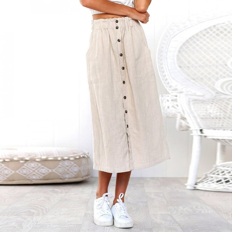 Jupe midi pour femme en coupe évasée. La jupe a une longueur sous le genou et une fermeture décorative à boutons. Matière légère et agréable.