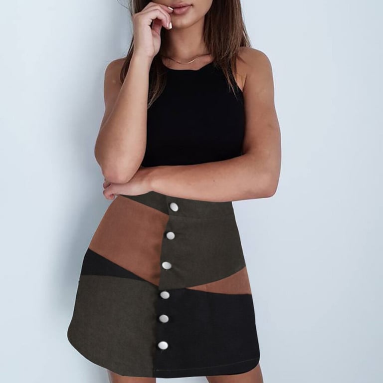 Jupe courte pour femme avec un motif géométrique. Taille haute. Fermeture décorative avec des boutons à l'avant. Disponible en deux variantes de couleur.