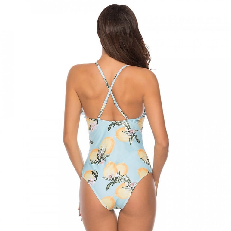 Maillot de bain une pièce pour femme avec des bretelles fines croisées dans le dos. Décolleté en V avec volant. Disponible en plusieurs coloris.