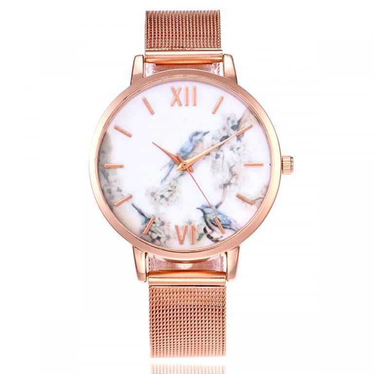 Montre femme au design élégant avec un motif d'oiseaux. Cadran avec chiffres romains. Bracelet ajustable. Disponible en plusieurs variantes.