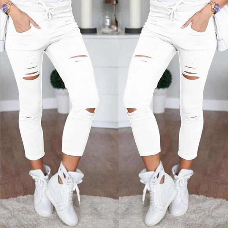 Pantalons skinny stylés pour femmes avec une taille élastique. Jambes étroites avec déchirures décoratives. Disponible en plusieurs coloris.