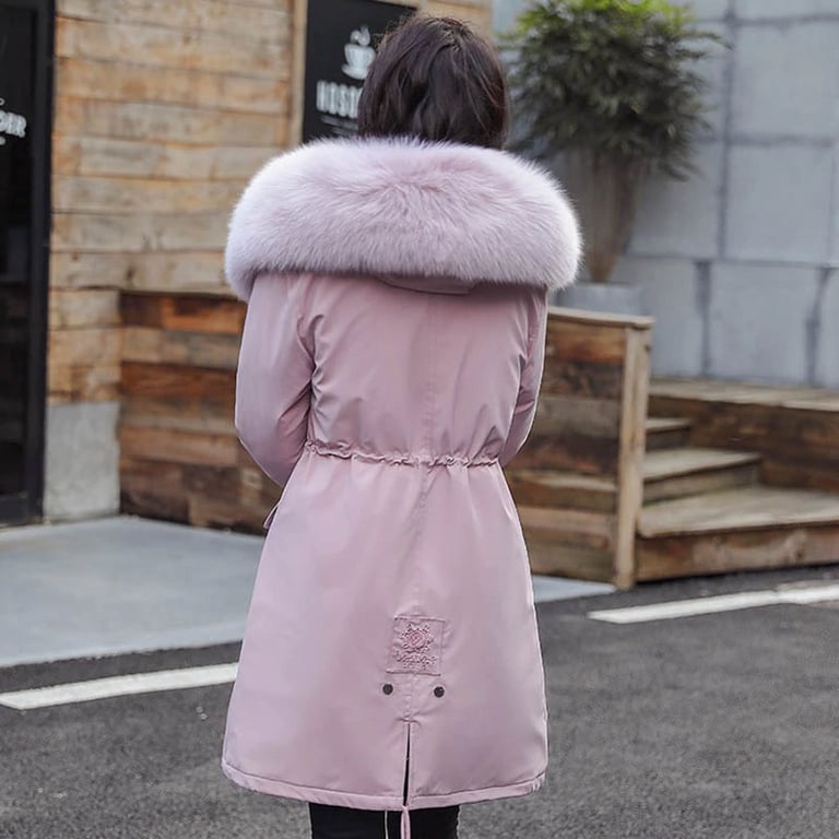 Parka d'hiver pour femmes avec capuche et doublure en fourrure chaude. La veste a une coupe longue et ample avec un élastique à la taille. Poches latérales. Isolée. Disponible en plusieurs coloris.