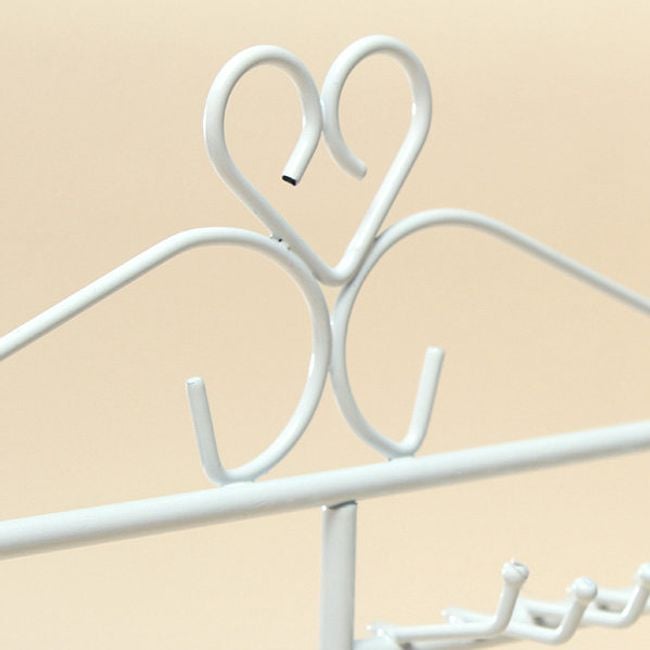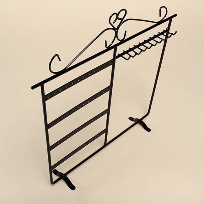 Organisez vos bijoux grâce à ce support. Il comprend des trous pour les boucles d'oreilles et des crochets pour suspendre colliers et bracelets. Le produit est disponible en trois couleurs.