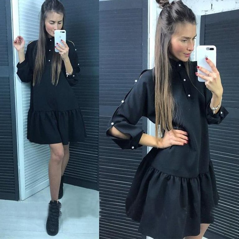 Robe courte pour femme à coupe décontractée. La robe a des manches longues et une jupe avec volants. Le décolleté et les manches sont ornés de perles blanches. Disponible en plusieurs coloris.