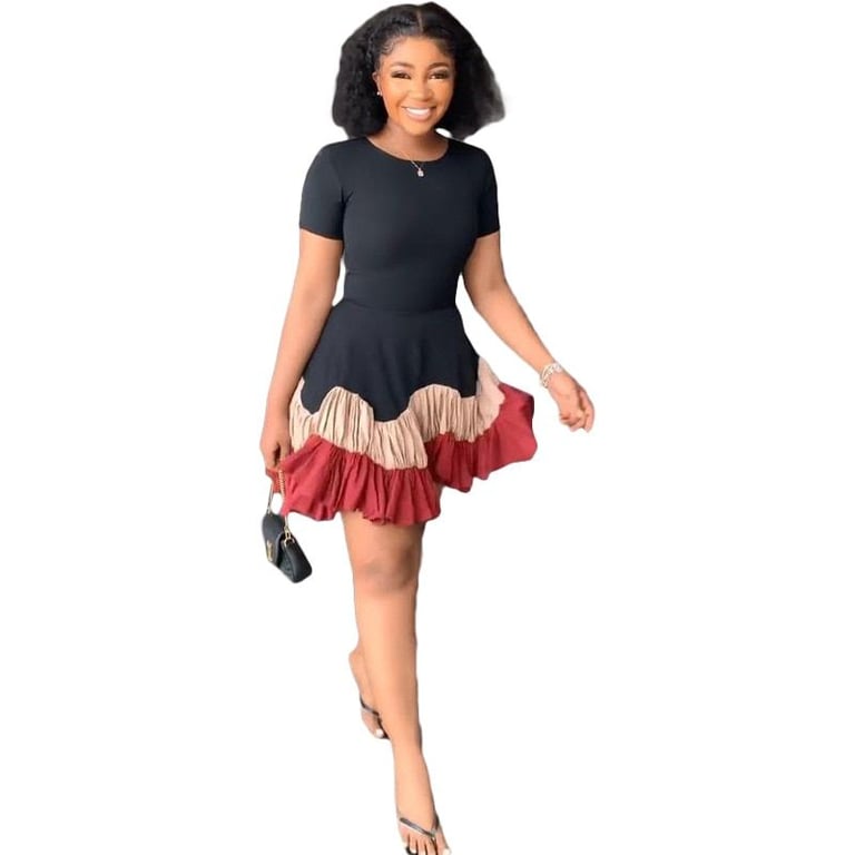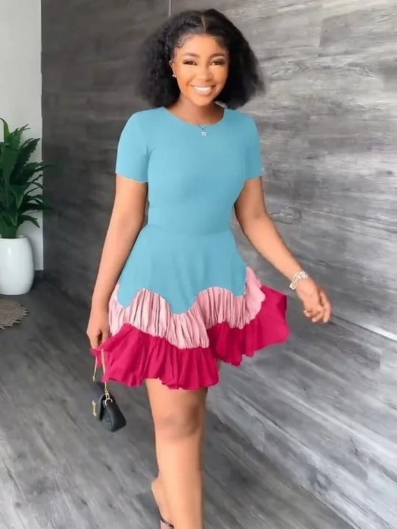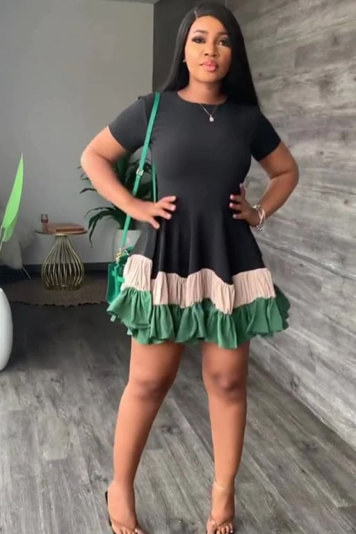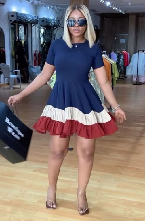 La robe est tricolore et possède une jupe froncée.