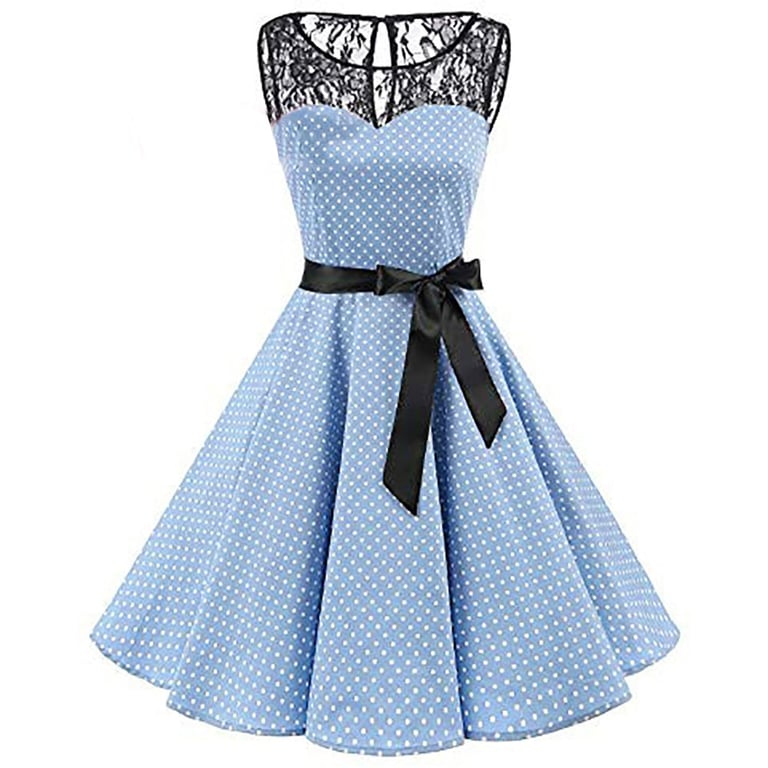 La robe est sans manches avec un décolleté orné de dentelle. Elle a un motif à pois avec un ruban à la taille et la jupe est coupée en forme de A. Vous brillerez certainement lors d'une fête, mais aussi lors d'un bal.