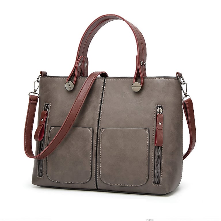 Sac à main en simili cuir avec une courte anse à la main et une bandoulière supplémentaire longue. Le sac se ferme par une fermeture éclair et possède des poches latérales. Disponible en plusieurs variantes de couleurs.