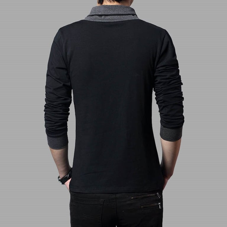 T-shirt pour homme à manches longues. Le t-shirt a un col en V avec un col et des boutons décoratifs. Disponible en deux variantes de couleur.
