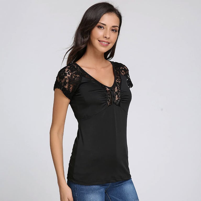 T-shirt/top pour femme à manches courtes. Le t-shirt a un décolleté en V avec des boutons. La manche est ornée de dentelle. Disponible en plusieurs couleurs.