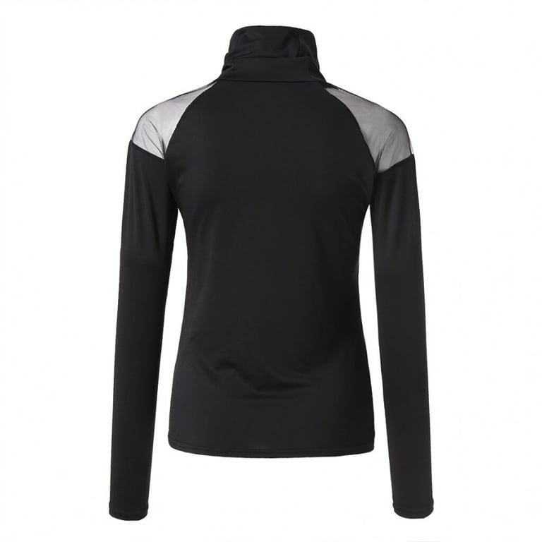 Top pour femme avec décolleté et col roulé. Le top a des manches longues en tissu transparent. Coupe ajustée.