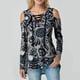 Top pour femme à manches longues avec des découpes aux épaules. Coupe ajustée et plus longue avec un décolleté en V et un laçage. Imprimé avec un motif coloré. Disponible en plusieurs variantes.