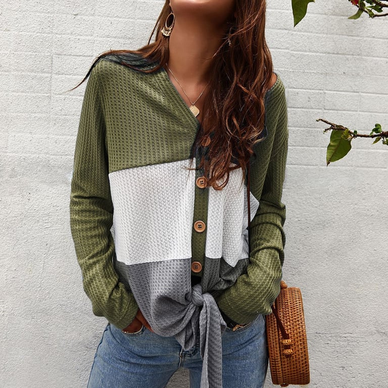 Top avec un lien attrayant, des boutons et un tissu à motifs. Choisissez parmi des couleurs agréables pour votre tenue d'automne.