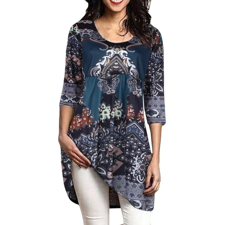 Blouse tunique pour femme avec des manches 3/4 et un col rond. Coupe ample et fluide. Imprimé avec un motif coloré. Disponible en plusieurs variantes.