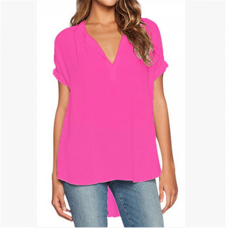 Blouse en chiffon pour femme à manches courtes et décolleté en V avec col. Coupe asymétrique ample. Matière légère et agréable. Tailles grandes disponibles. Plusieurs options de couleurs au choix.