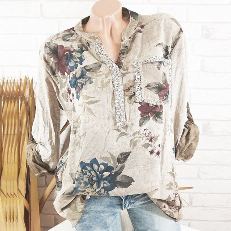 Blouse femme à manches longues. La blouse a un décolleté en V avec un col bas. Poche poitrine. Imprimé à motif floral. Tailles grandes. Disponible en plusieurs variantes.