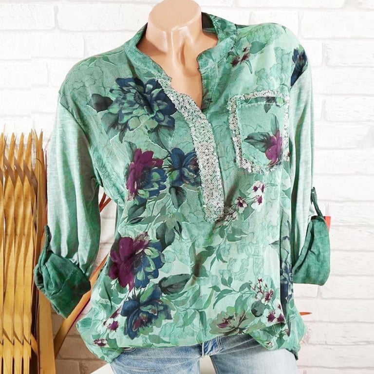 Blouse femme à manches longues. La blouse a un décolleté en V avec un col bas. Poche poitrine. Imprimé à motif floral. Tailles grandes. Disponible en plusieurs variantes.