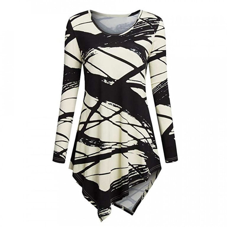 Blouse femme avec une coupe asymétrique ajustée. La blouse a des manches longues et un col rond. Imprimé avec un motif coloré. Disponible en deux variantes.