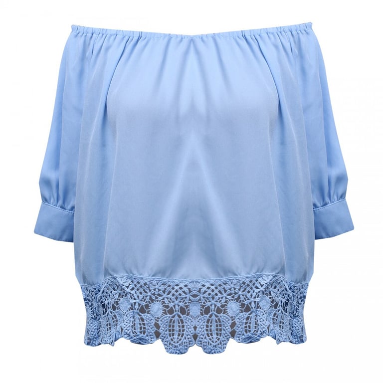 Blouse femme avec des manches bouffantes et un décolleté dénudé. Coupe ample avec un ourlet en dentelle.