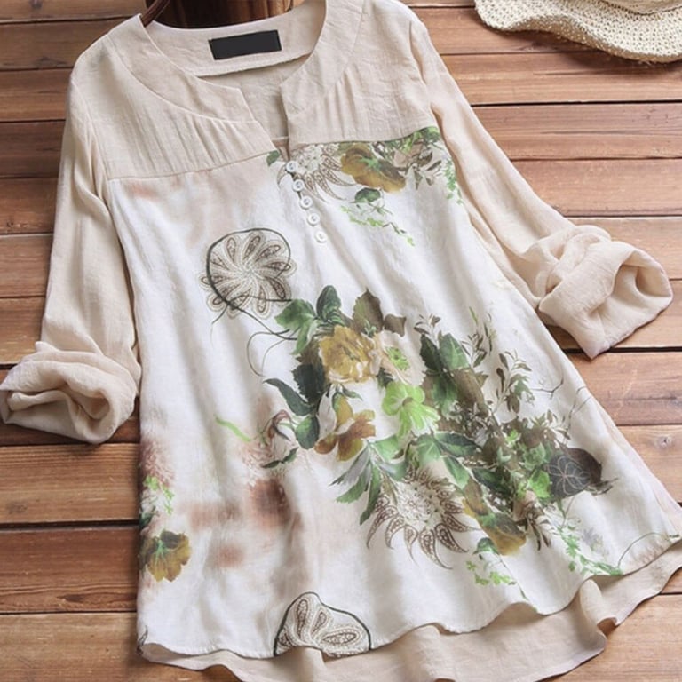 Blouse tunique pour femme avec décolleté rond et manches longues. Coupe longue et ample. Imprimé coloré avec motif floral. Disponible en plusieurs variantes.