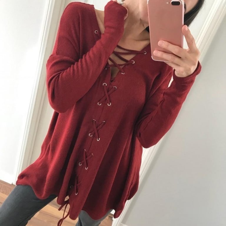 Blouse pour femme à manches longues. La blouse a un décolleté en V avec un lacet. Coupe longue et ample. Disponible en plusieurs coloris.