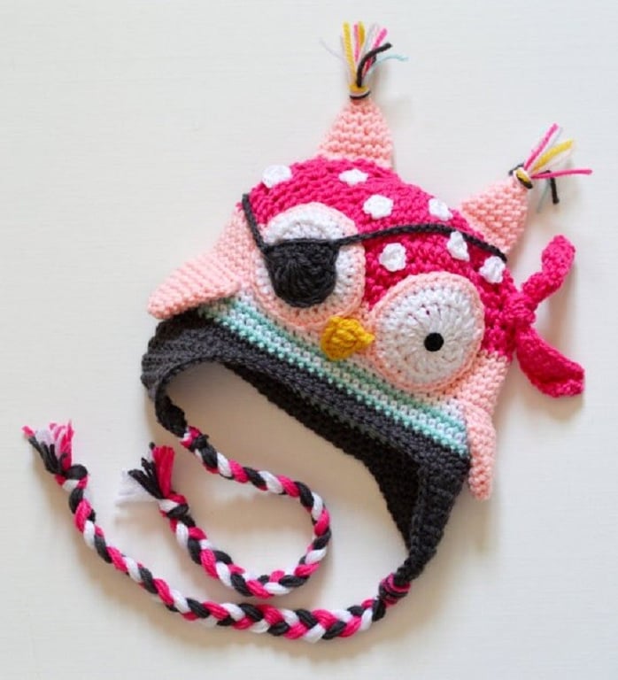 Magnifique bonnet en crochet couvrant les oreilles avec un hibou pirate.