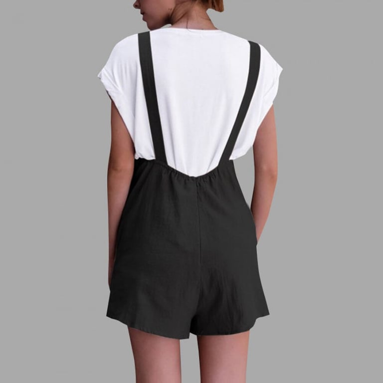 Combinaison pour femme avec bretelles et poches avant. Coupe ample avec des jambes courtes. Disponible en plusieurs coloris.