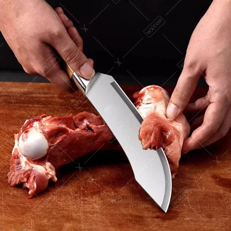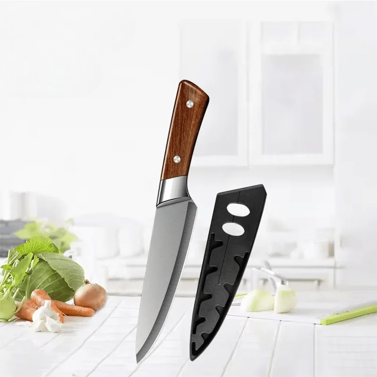 Ces couteaux de cuisine se distinguent par leur design original et leur fabrication pratique. La lame incurvée facilite la découpe et le hachage, tandis que la poignée en bois ergonomique assure une prise en main ferme et confortable. Chaque couteau est livré avec un étui en plastique qui protège la lame même lors du rangement.