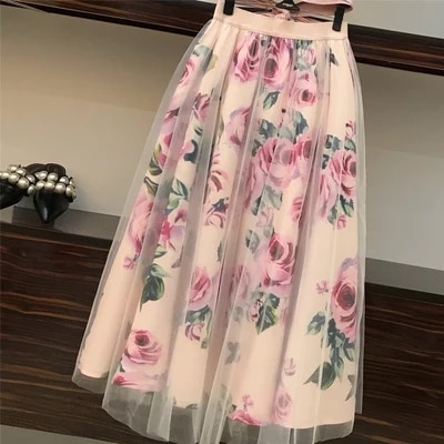 Bel ensemble de mode pour femmes comprenant un chemisier et une jupe. La jupe est à motif floral et le chemisier a une coupe tendance.