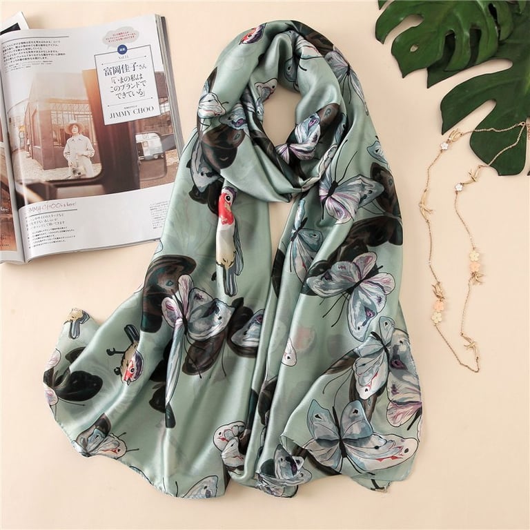 Écharpe en satin pour femme avec une surface lisse et brillante. Matériau léger. Imprimé avec un motif coloré.