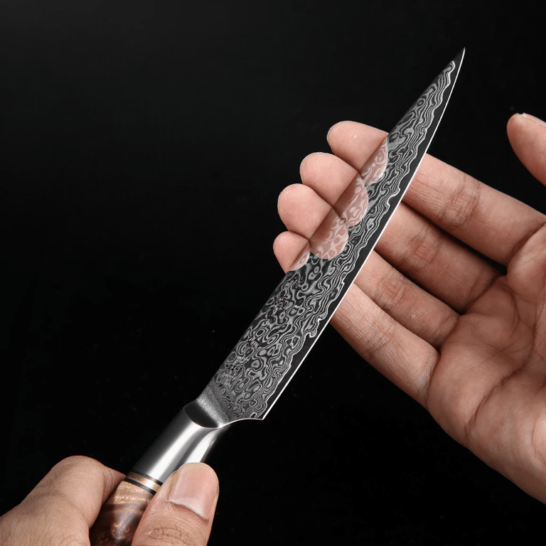 Couteau de cuisine professionnel HEZHEN en acier damassé véritable allie une précision exceptionnelle à un magnifique motif naturel de la lame. Avec une lame de 13 cm, il est l'assistant universel idéal dans toute cuisine – adapté pour la coupe de légumes, le découpage de la viande, la préparation des herbes et d'autres ingrédients.