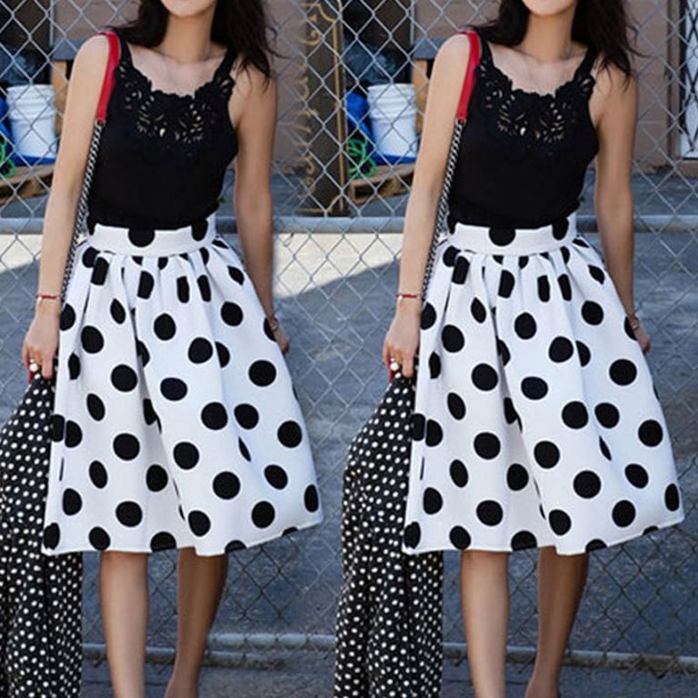 Jupe large pour femme au style rétro. La jupe a une forme évasée et une taille haute. Blanche avec un imprimé de grands pois noirs.