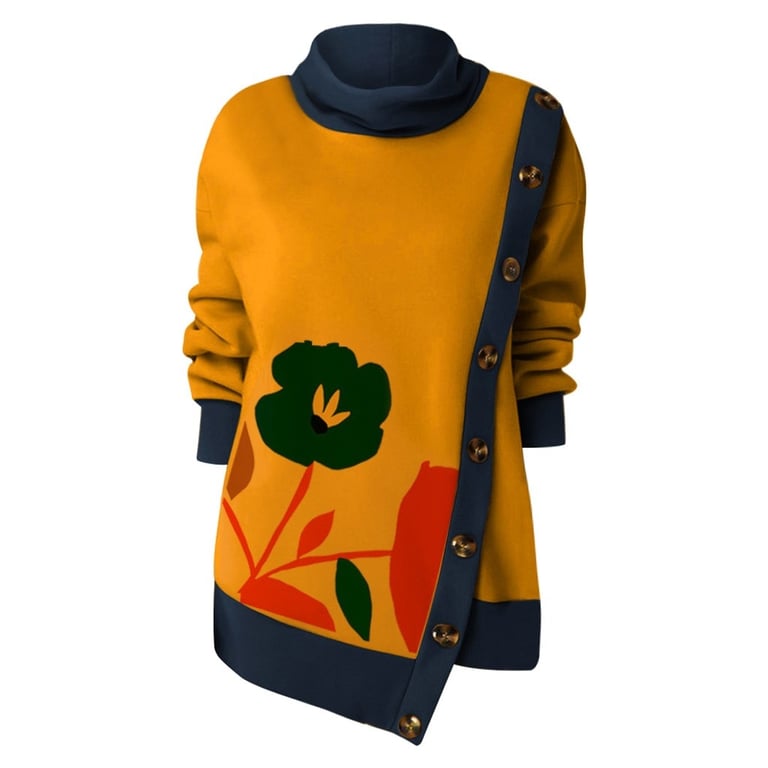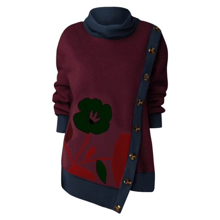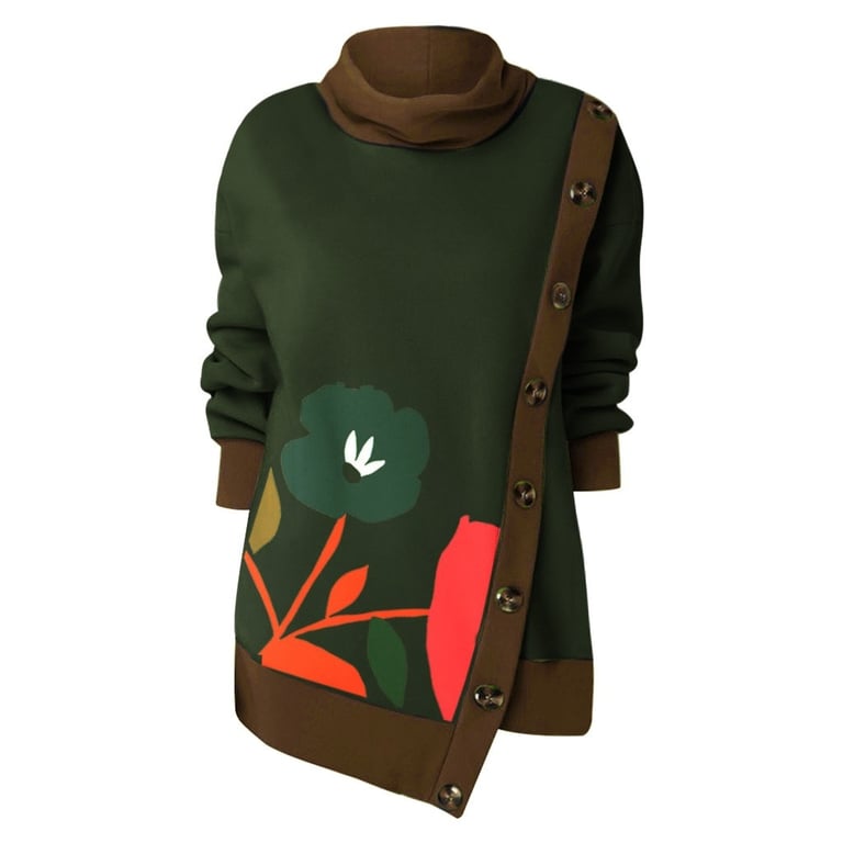Pull long pour femme, isolé, avec un motif floral. Le pull a un col roulé et une fermeture à boutons. Un choix évident pour l'hiver.