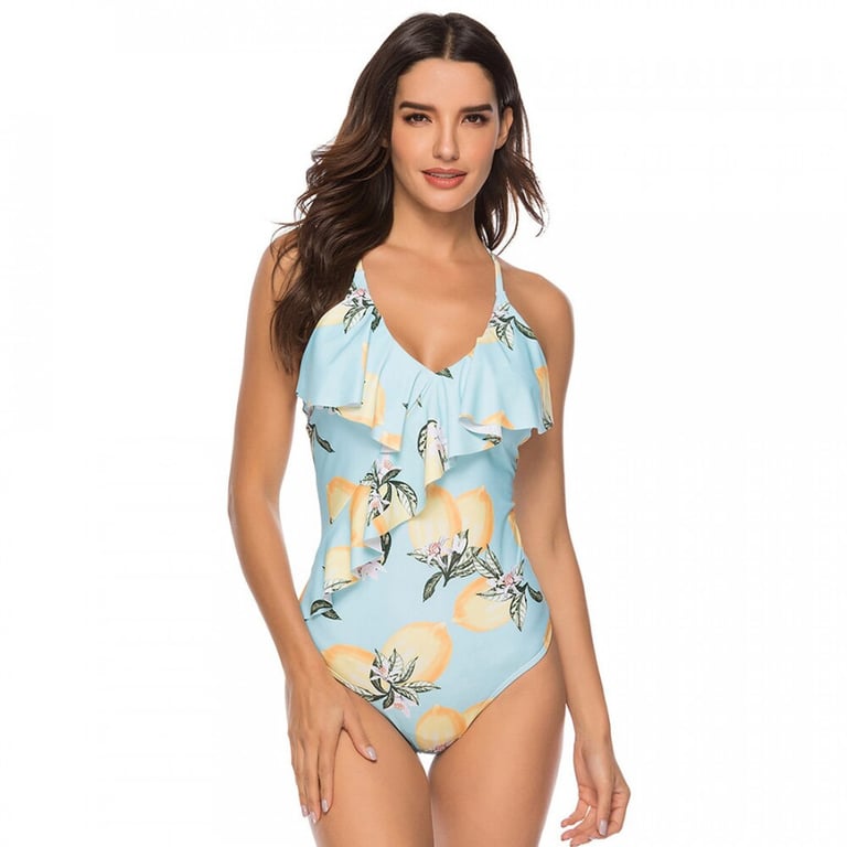 Maillot de bain une pièce pour femme avec des bretelles fines croisées dans le dos. Décolleté en V avec volant. Disponible en plusieurs coloris.