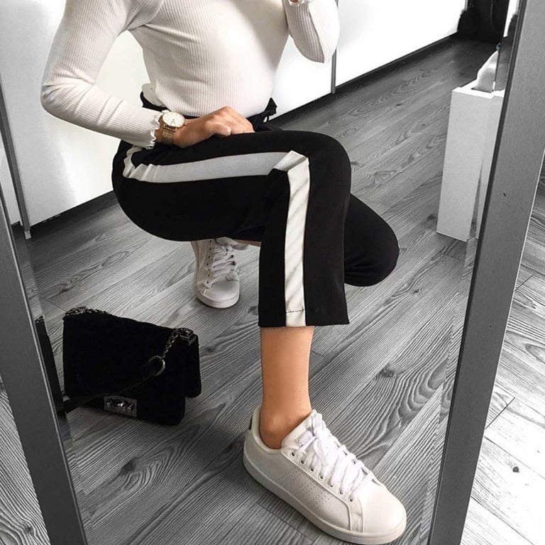 Pantalons pour femmes taille haute avec ceinture à nouer. Coupe ample avec une bande sur le côté. Disponible en plusieurs variantes de couleurs.
