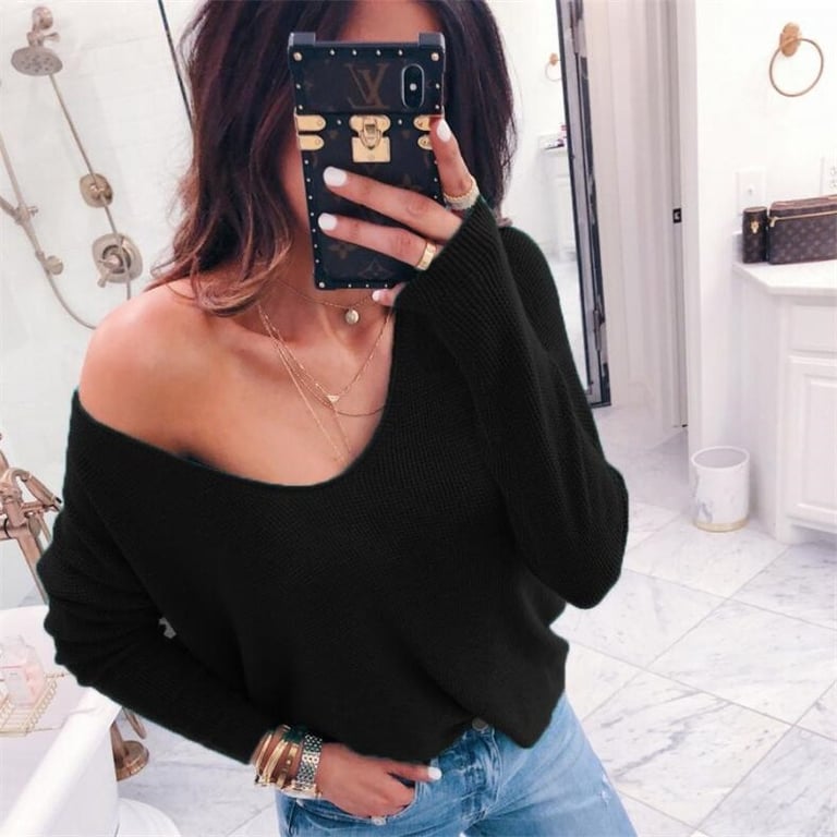 Pull femme à manches longues et décolleté plongeant avec épaule tombante. Coupe ample et confortable. Disponible en plusieurs coloris.