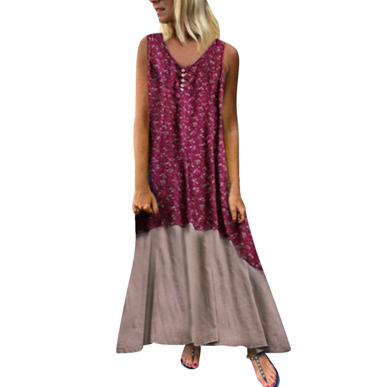 Robe maxi femme dans le style boho. La robe est sans manches avec de larges bretelles et un décolleté avec des boutons. Coupe longue et ample avec un motif floral coloré. Disponible en plusieurs variantes de couleurs.
