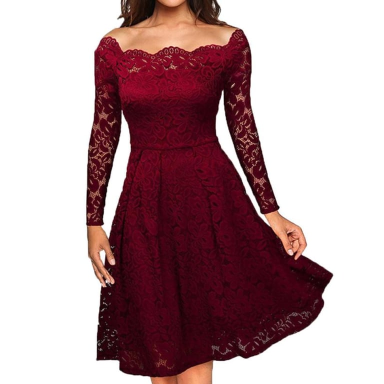 Robe de soirée pour femme avec dentelle et décolleté épaule dénudée. La robe a des manches longues et une jupe fluide jusqu'aux genoux. Disponible en plusieurs variantes de couleurs.