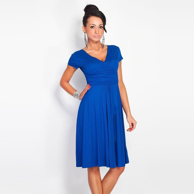 Robe femme fluide jusqu'aux genoux. Manches courtes. Décolleté en V croisé. Disponible en plusieurs coloris.