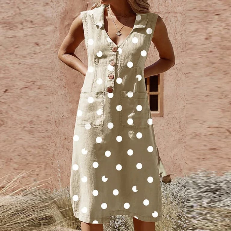 Robe d'été sans manches pour femmes. Coupe longue et ample avec poches avant. Col avec boutonnière. Motif à pois. Plusieurs variantes de couleurs.