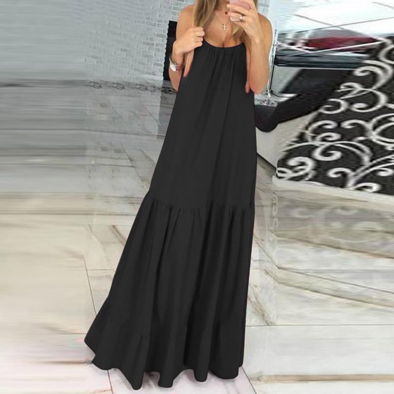 Robe maxi pour femme à bretelles. Encolure ronde avec fronces. Coupe longue et ample. Disponible en plusieurs coloris.
