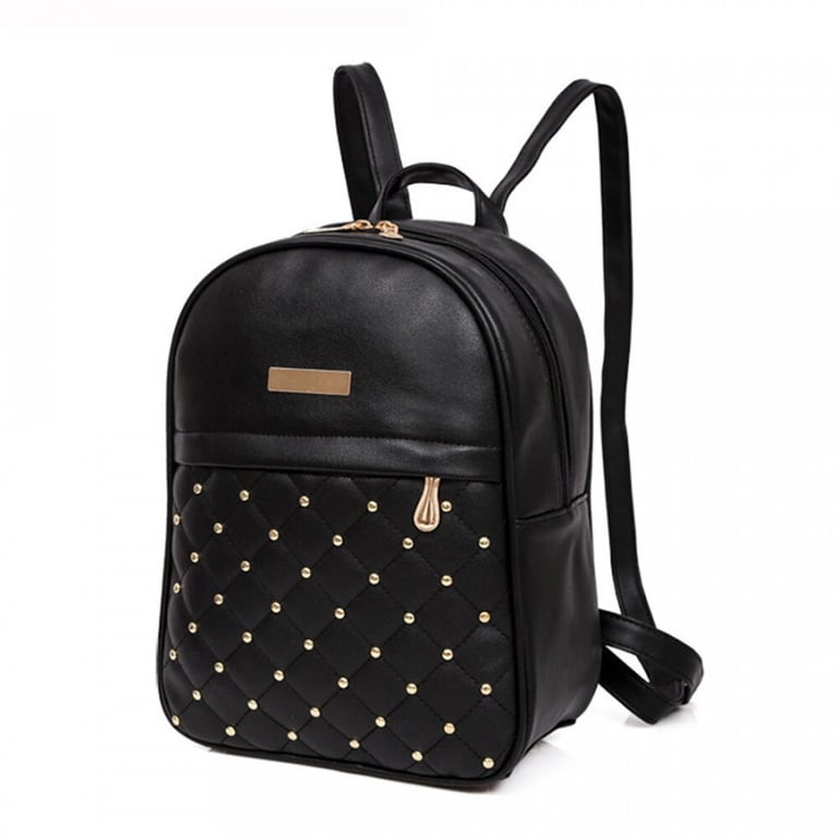 Sac à dos en simili cuir pour femmes avec des bretelles réglables. Clous décoratifs sur le devant. Grande poche zippée. Petite poche avant zippée. Disponible en plusieurs couleurs.