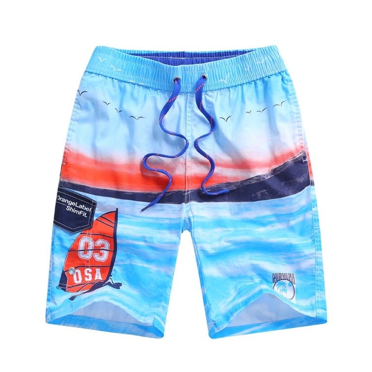 Magnifiques shorts de plage avec un imprimé coloré de l'océan et un bateau à voile rouge avec le numéro 03.
