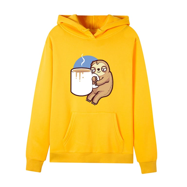 Pull classique pour femme avec un imprimé de paresseux en train de boire du café. Le pull a des manches longues, une poche kangourou et une capuche.