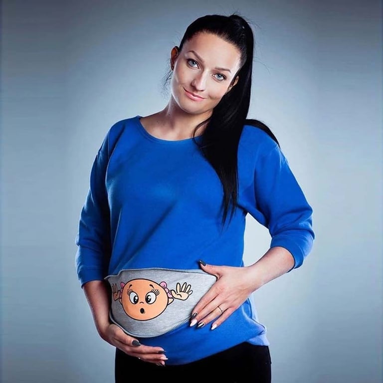 Un sweat confortable pour femmes avec un motif de bébé dans la poche, que vous pouvez porter zippé ou déboutonné.