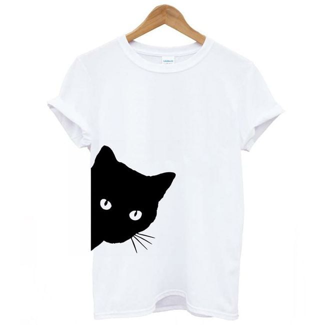 Le devant du t-shirt à manches courtes est décoré d'une tête de chat qui semble regarder par votre côté.