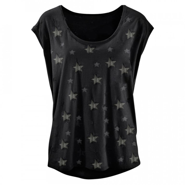 T-shirt pour femme à manches courtes et col rond. Le t-shirt a une coupe ample et confortable avec un imprimé de petites étoiles. Disponible en plusieurs couleurs.