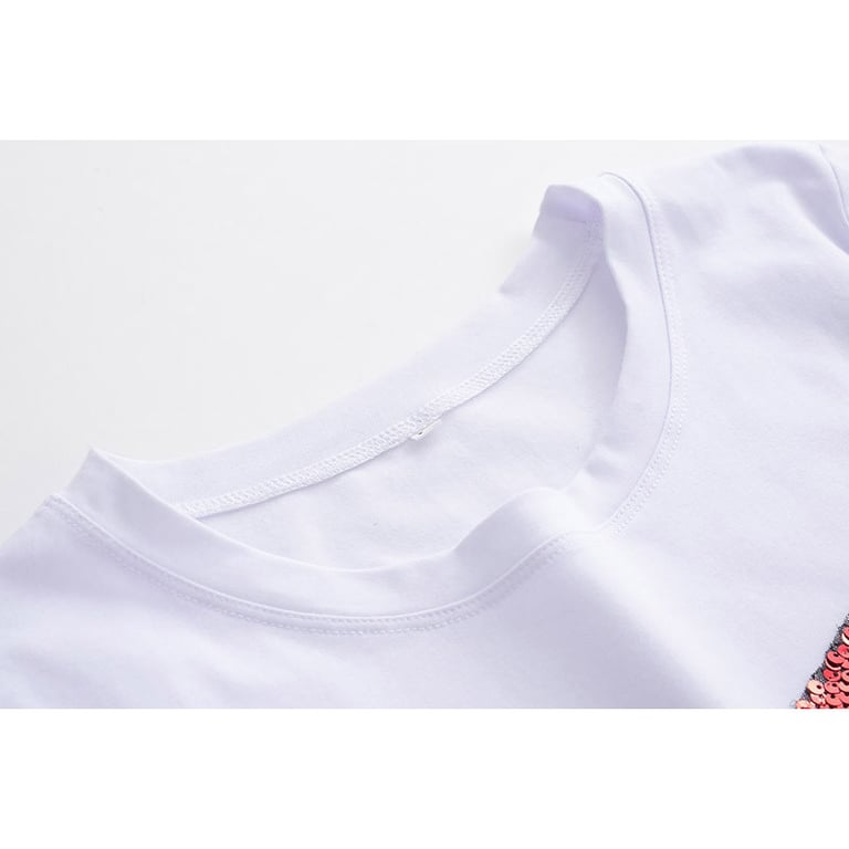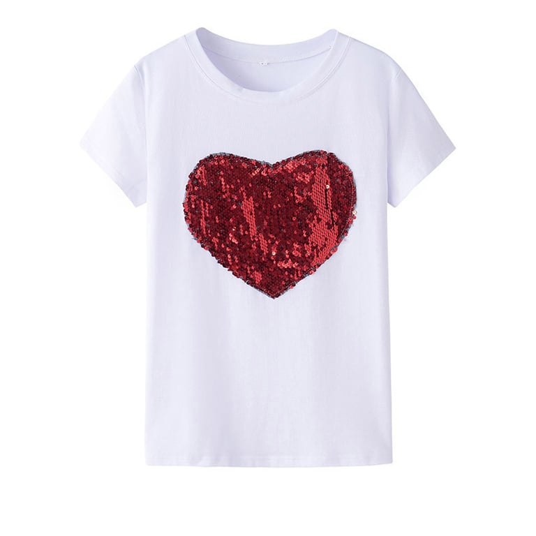 T-shirt femme à manches courtes et col rond. Matière agréable, coupe confortable. Impression d'un cœur avec des paillettes rouges sur le devant. Disponible en deux variantes.