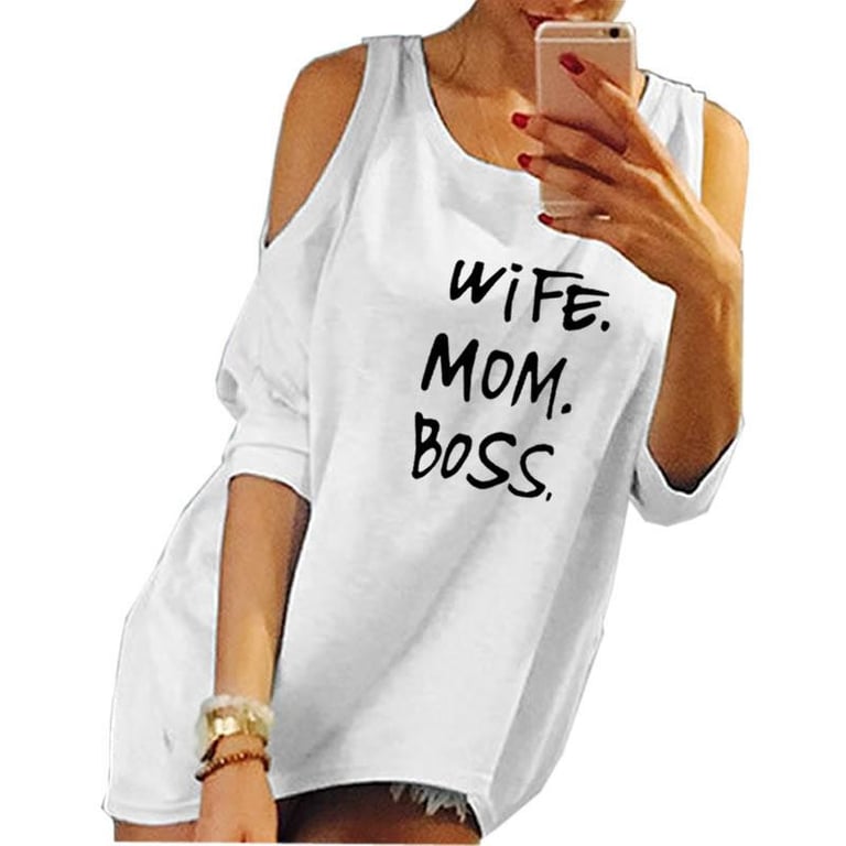 T-shirt femme à manches 3/4 et épaules dénudées. Encolure ronde. Coupe longue et ample avec impression sur le devant. Plusieurs variantes de couleurs.